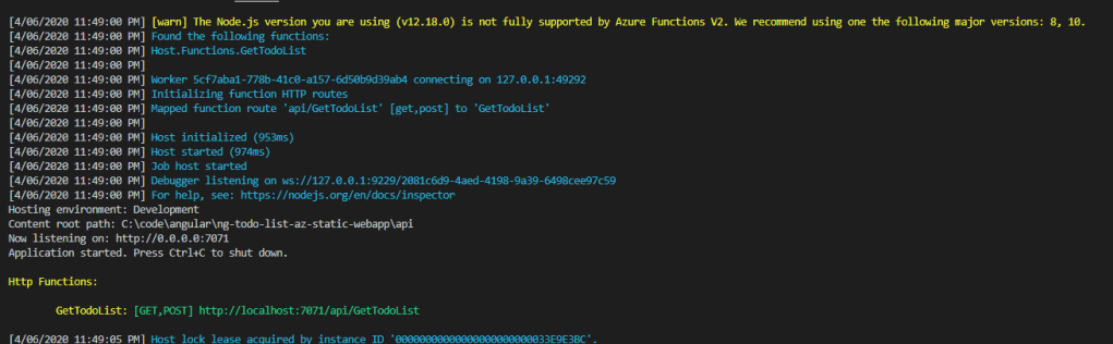 Its time to make sure everything works fine. Click the overview tab then click on the URL for the site, it should open the static site web created in previous post. To access the API, you have to append api/FUNCTION_NAME. in our case, it will be URL/api/GetTodoList