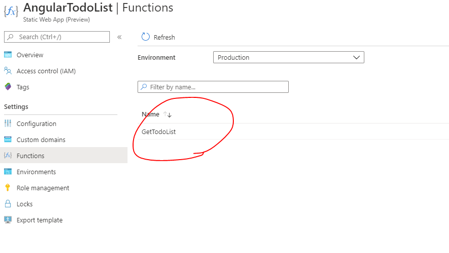 Once the GitHub action finishes and show a success mark, open Azure Portal and go to your Azure Static Web App then click Functions on the left menu. You should be able to see the GetTodoList function there.